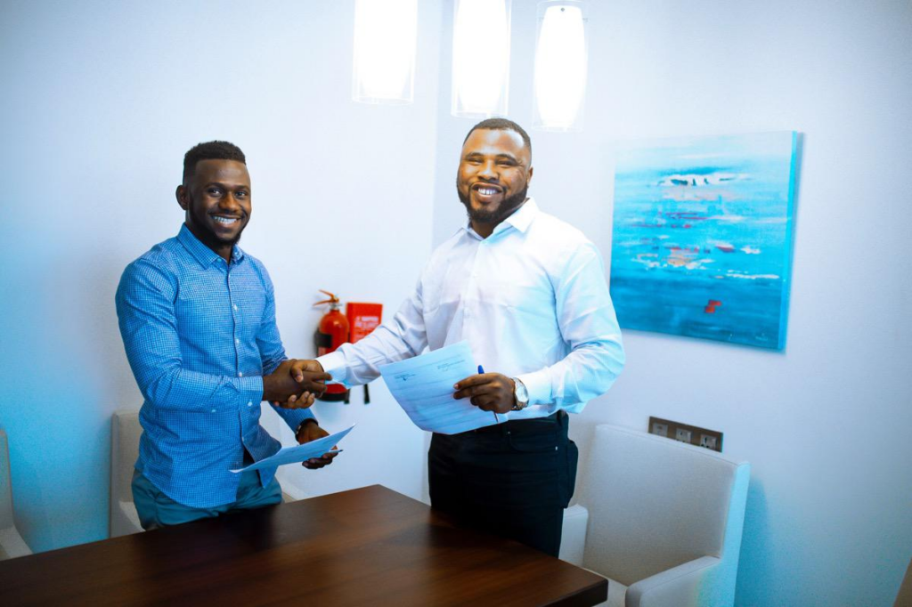 L-R: Favour Ori shakes Gaius Chibueze on the acquisition deal of College Situation App