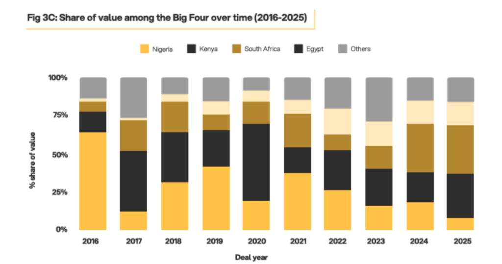 Nigeria remained Africa’s busiest startup market in 2025 by deal count, reflecting strong early-stage formation and steady seed activity. More companies raised capital there than anywhere else on the continent. But the biggest cheques increasingly landed elsewhere.