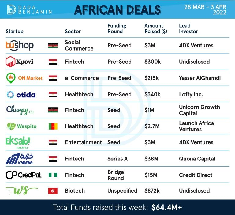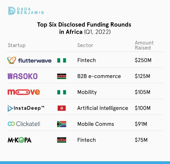- Top six disclosed funding rounds by African startups in Q1 2022.
