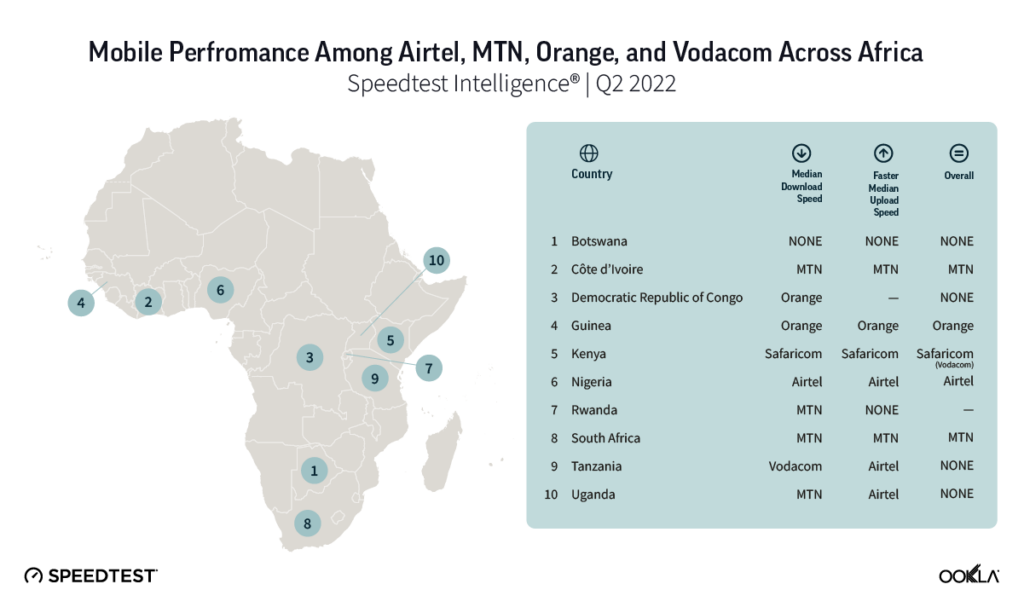 As of Q2 2022, MTN Nigeria commanded 38.9% of Nigeria's mobile users, with its 74.1 million subscribers almost double that of Airtel’s 46.0 million, Yet when it comes to mobile performance, Airtel Nigeria was ahead of MTN; in Q2 2022, according to data analysed by Ookla—a global leader in network intelligence and connectivity insights. Airtel Nigeria recorded a median download speed of 30.35 Mbps and a median upload speed of 10.28 Mbps, both of which topped those of MTN (26.30 Mbps download and 9.13 Mbps upload). According to the analysis, the aforementioned speeds are set to increase as both companies have invested heavily into network infrastructure, with a combined investment of N208.5 billion ($502 million). The investment translates into an increase in 4G Availability as well. In Q2 2022, MTN had 83.8% 4G availability compared to Airtel's 77.9%. In August 2022, MTN became the first telecommunication provider in Nigeria to roll out the 5G mobile network. Currently, it is available in 10 States, and on a total of 195 MTN sites. Outside of Nigeria, MTN outperformed Orange in Côte d’Ivoire and Vodacom in South Africa, both in terms of median download and upload speeds: When it comes to mobile speeds in capital cities, it is not surprising that cities that have 5G networks came top of the list. As such, Johannesburg led the pack, with a median download speed of 66.54 Mbps, ahead of Cape Town at 49.22 Mbps. Vodacom got ahead of MTN in Johannesburg and was the fastest operator across the 12 cities that Ookla analysed, with a median download speed of 81.36 Mbps in Q2 2022 compared to 73.83 Mbps in Q1 2022. MTN was faster in Cape Town. Taking 5G out of the equation, Orange in Gaborone, the capital city of Botswana, achieved median download speeds of 39.46 Mbps. While MTN had better download speed in the Democratic Republic of Congo, in Rwanda MTN performed better than Airtel with regards to median download speed. Orange took the top spot in Guinea, Airtel in Nigeria, and Safaricom in Kenya. In the rest of the countries, the difference in mobile performance was either not statistically significant or there was not a single operator that delivered a better performance both upstream and downstream, Ookla revealed. The mobile performance of African telecoms. Credit: Ookla The market share of African telecoms Uganda: MTN’s 53.9% market share in Uganda translates to 16.3 million subscribers as of Q2 2022. Meanwhile, Airtel Uganda had a 45.1% market share (13.6 million). Rwanda: MTN Rwanda increased its customer base by 1.7% year-on-year (YoY) to 6.6 million as of Q2 2022, expanding its lead in customer market share by 2.7 pp to 65.6%, Airtel controlled the remainder of the market. Botswana: Mascom (MTN) is the largest operator in Botswana, with 1.8 million subscribers in Q2 2022 and a 42.2% market share. Orange is the second largest operator, ending Q2 2022 with 1.7 million subscribers and 41.2% market share. Côte d’Ivoire: MTN had a 38.9% subscriber market share in Côte d’Ivoire as of Q2 2022, which equates to 15.8 million subscribers, Orange ended Q2 2022 with 14.6 million subscribers (36.0% market share). Guinea: Market leader, Orange, which switched on its 4G network in 2019, accounted for 60% of mobile connections in Q2 2022 in Guinea, ahead of MTN (30.8%). According to telecom regulator ARPT, in Q4 2021, Orange held a 69.9% market share of mobile Internet traffic, while MTN held 26.9%. Kenya: Safaricom is the largest operator in Kenya by a mile, with 67.1% market share (equivalent to 42.7 million connections) ahead of Airtel 25.9% (16.4 million). Tanzania: Tanzania’s mobile market is served by seven mobile operators, making it one of the most competitive markets in Sub-Saharan Africa. Vodacom ended June 2022 with 15.6 million subscribers, which translated into a 28.8% market share, GSMA Intelligence estimates that Airtel held a 27.4% market share in Q2 2022, equivalent to 14.8 million subscriptions. Editor's Note: All the data referenced in this article was analysed and shared with thecondia.com by Ookla.
