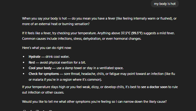 ChatGPT isn’t dumb. In fact, it’s often too helpful. When prompted with “my body is hot,” a general model like GPT-5.2 asks useful follow-ups: it clarifies if you mean a fever or a skin sensation, suggests hydration, and lists low-risk monitoring steps.