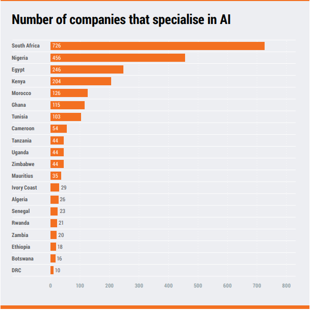 The graph below demonstrates that South Africa is leading in AI-focused companies in Africa. There is also a large disparity between AI startups in different nations, as seen by 726 companies in South Africa which specialise in AI, with the rest of the countries with less than 500 companies that are AI-focused.