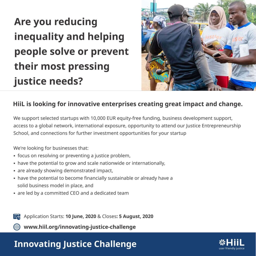 Hague Institute for Innovation of Law (HiiL) is calling for applications for the 2020 Innovating Justice Challenge. Is your organisation developing sustainable, scalable solutions to pressing justice needs? Are you creating access to justice, reducing inequality and unfairness? Then you should apply for the HiiL Innovating Justice Challenge. We are looking for promising innovations that are already showing measurable impact, have the potential to become financially sustainable, and have the plans and ambition to scale across different markets. These enterprises are led by a strong team with experienced and inspiring founders. This year, as a result of Covid-19 and its impact across sectors, it has become even more important to identify and support those startups and organisations that are reducing inequality and modernising access to justice. We want to help them to reach more people, more quickly. "From what we've seen over the years, justice innovations come from all sectors of society as they underpin the Sustainable Development Goals intending to reduce all forms of inequality", Odunoluwa Longe, HiiL's Justice Accelerator Head for West Africa, said. "Some innovation reduce the cost of legal services, some reduce financial inequalities, some reduce disputes by visualizing legal information and contracts and others are designed to support informal mechanisms of conflict resolution in communities". Longe is also a justice innovator. She co-founded DIYlaw, a past Innovating Justice Challenge winner. At the 2019 Innovating Justice Challenge, Nigerian startup Bankly and Ghanian startup Appruve came first and second, respectively. Applications for the challenge is open from June 10 till August 5, 2020. Apply here. The Innovating Justice Challenge scouts and selects the most promising justice innovations for the Justice Accelerator programme. The Justice Accelerator offers a four-month programme that provides €10,000 non-equity, non-debt funding, business development support (which includes training, coaching and mentorship), access to a global network, international exposure, and connections for further investment opportunities for startups. HiiL's Justice Accelerator is the only accelerator in the world that focuses on preventing and resolving justice problems. We look for startups that can grow and scale to impact thousands and potentially millions of people. HiiL has supported more than 110 justice innovations worldwide since 2011. Some of those innovation have impacted the lives of hundreds of thousands of people and scaling to a regional level with the potential to become global players. Examples of startups that we have supported in West Africa in the past include: a mobile app operated by agents to help people without smartphones and internet save without falling victim to fraud; a bot-powered mobile app that provides answers to legal questions for SMEs in Francophone West Africa; a website that helps prevent digital fraud through identity verification and protection and intrapreneurs within a state ministry of justice that are using community-focused ADR to bring peace to conflict-ridden communities. Interested entrepreneurs should apply now.