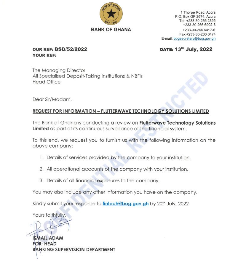 The Bank of Ghana (BoG) is conducting a review on the activities of Flutterwave in the country. In a request for information letter (dated July 13, 2022) from BoG to financial institutions in Ghana seen by thecondia.com, Ismail Adam, the Head of Bank Supervision said: "The Bank of Ghana is conducting a review on Flutterwave Technology Solutions Limited as part of its continuous surveillance of the financial system." Adam instructed the financial institutions to provide the details of services provided by Flutterwave to their institutions, as well as the fintech company's operational accounts and other financial exposure details. All of this information was meant to be submitted to BoG by July 20, 2022. Even though Flutterwave has been operating in Ghana for a while, it has not been listed by the BoG as an approved fintech and innovation institution. However, it is not uncommon for African fintech startups to commence groundwork before securing a license. Flutterwave is listed on Ghana's Registrar General’s Department—a department of the Ministry of Justice and Attorney General. Flutterwave listed on Ghana's Registrar General's database The ongoing review by the Bank of Ghana is coming within a period where Flutterwave has been accused of several financial misconducts. The Central Bank of Kenya (CBK) recently announced that Flutterwave and Chipper Cash are not licensed to operate in the country. CBK further instructed financial institutions in Kenya to "cease and desist from dealing with Flutterwave and Chipper Cash". Prior to CBK's move, the Kenyan Asset Recovery Agency (ARA) secured a court order to freeze bank accounts linked to Flutterwave citing "international money laundering". However, the fintech denied the allegations. Since its launch, Flutterwave has been on a mission to create endless possibilities for customers and businesses in Africa and the emerging markets. To date, the company has processed over 200 million transactions worth over $16 billion across 34 countries in Africa including Nigeria, Uganda, Kenya, and South Africa. In February 2022, the fintech company raised $250 million in Series D funding led by B Capital Group, with participation from Alta Park Capital, Whale Rock Capital, Lux Capital. Existing investors—Glynn Capital, Avenir Growth, Tiger Global, Green Visor Capital and Salesforce Ventures. The Series D raised the company's valuation to over $3 billion. Editor's Note: This is a developing story, it will be updated as more details emerge. August 1, 9:57 AM—We edited the word "investigation" to reflect the BoG's choice of the word "review"