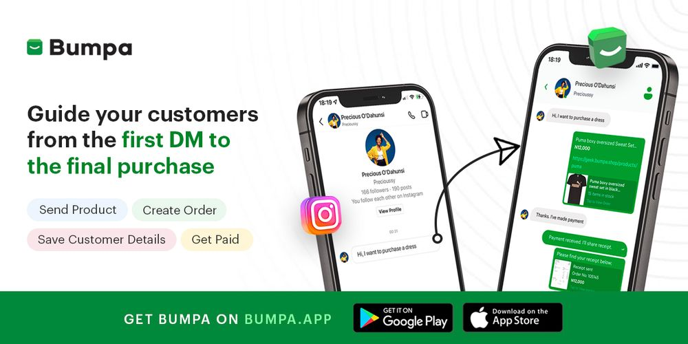 • Seamless Customer Service: Customers of any Bumpa merchant using the integration can make inquiries about products & make payments without leaving Instagram while the merchants will be able to capture their Instagram details and record the sales automatically from their Bumpa app.