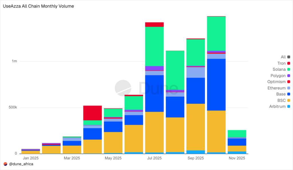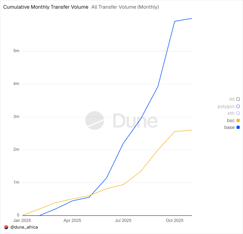 If you witnessed the flop of Nigeria’s CBDC, eNaira, you might be tempted to ask how the cNGN, though different, is performing. In 28 months, eNaira facilitated only about 855,000 transactions worth about $18.3 million (₦29.3 billion). cNGN is on track to eclipse this amount in one-third of the time. The cNGN is Nigeria’s first SEC-regulated local stablecoin issued by WrappedCBDC Limited, in collaboration with the Africa Stablecoin Consortium (ASC), of which WrappedCBDC is a part. It is reportedly pegged 1:1 to the Nigerian Naira (NGN) and minted on the Bantu public blockchain. Launched in February 2025, it is now available on major blockchains and listed on top African exchanges like Quidax and Busha. With cNGN, end users can make online payments and international remittances faster and more cheaply than with traditional methods. They can also use it to trade with other currencies on a crypto exchange or save in naira without the account maintenance fees charged by banks. Analysing cNGN's growth Using Dune, an analytics tool for on-chain data, we track data from cNGN smart contracts on the major blockchain networks: Ethereum, Binance’s BNB Smart Chain (BSC), Polygon, and Coinbase’s Base. The analysis reveals that cNGN’s transfer volume has been growing at an average of 77.42% month-on-month between February and October. Its total transfer volume in those nine months is over $15.8 million. Notably, there seem to be real-world uses of cNGN as opposed to other forms of speculative trading. Wallet-to-Wallet transactions, with use cases like remittance and payments, make up more than half of all transfers (51.46%) involving cNGN. What is driving the adoption of cNGN? Two forces are driving the adoption of cNGN: the growth of fintechs using cNGN and competition between blockchains. Since cNGN is a token without a consumer interface, its growth comes from fintechs and financial institutions leveraging it to power their products. “Most of the growth is from fintechs like (use)Azza that integrated cNGN early into their core flows and are now growing really fast...their growth is supporting our growth,” says Uyoyo Ogedegbe, Managing Director of WrappedCBDC. Launched about the same time as cNGN, Azza is a WhatsApp AI agent for buying and selling crypto. It allows users to buy and sell cNGN for naira or other digital currencies across more than eight chains, including Solana. Last month, it hit a new all-time high of $1.49M transactions, surpassing its former peak of $1.43M in July. However, an interesting shift took place between July and October 2025. Base moved from being the third to the topmost blockchain for useAzza transactions, which epitomises one of the other underlying forces propelling the growth of cNGN. Base’s push in West Africa is spurring cNGN adoption Base, operationalised last year in West Africa, has made significant investments that are spurring on-chain market activity. For instance, it hired a West Africa Lead to focus on market development. Within a year, they have organised several community initiatives aimed at getting idea and market-ready founders and startups to “build on Base”. One of such initiatives is the Based Founder Fellowship Africa. “We recently concluded a Fellowship where we brought in a16z, Electric Capital & 1confirmation as VC partners and connected 20 African founders to these VCs. This is the first time this has ever happened on the continent,” says Damilare Aregbesola, Base’s West Africa Lead. Base’s strategy is working. Despite a trailing start to BSC in February 2025, cNGN transactions on Base are growing faster than everywhere else at 86% monthly average, BSC (38%). For instance, as of March, Base processed only $196,000 of cNGN’s monthly transfer volume while BSC was processing double ($387,000). However, the cross-over came in June, as Base processed 39% ($1.14M) more cNGN volume than BSC ($0.8M). Since then, the gap between those two has widened significantly. Ogedegbe credits Base for their work in spurring cNGN adoption. He said, “Base is aggressively growing as an ecosystem in our market, and that means projects are being onboarded weekly...especially given their regional focus and team leads pushing community growth in Africa. A number of platforms are coming to trust cNGN and are developing products, ideas and infrastructure that naturally increase the liquidity depth of cNGN,” says Ogedegbe. As of Q3, more than 25 products were live on Base with 50 more in production, including heavy-hitters like HuruPay, Blockradar and base-incubated startups like paycrest, zerocard and zoracle. “No other ecosystem has the number of quality products Base has in & out of the payment sector in the continent,” Aregbesola brags. With more founders building on Base more transactions will happen via cNGN, as access to the Nigerian market is key. “What really pushed cNGN on Base is the increase in the number of products being built on Base, which in turn, use cNGN to handle payouts,” Aregbesola explains. Why do founders keep choosing Base? While the network's lower fees and smoother user experience are critical, many more things appeal to founders regarding working with Base. Base’s appeal stems from three main areas, the West Africa lead tells Condia. First, its affiliation with Coinbase, which is one of the most powerful brands in the crypto world. This affiliation can help boost a startup’s credibility and unlock access to introductions to other stakeholders in the value chain. The startups can also access Coinbase-developed infrastructure to build their product. Second, financial support. Coinbase has a dedicated vehicle for investing in startups via its Coinbase Ventures fund. For instance, Onboard Global is a Coinbase Ventures’ portfolio company. Beyond Coinbase Ventures, it also has access to other VCs interested in the crypto space and connects founders, just as it is doing with the second edition of its Ba