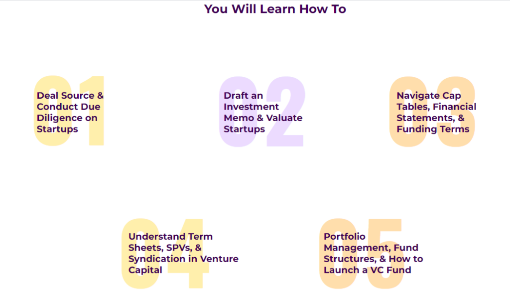 - Weekly training sessions and project assignments emulating real work done by VC analysts and associates.