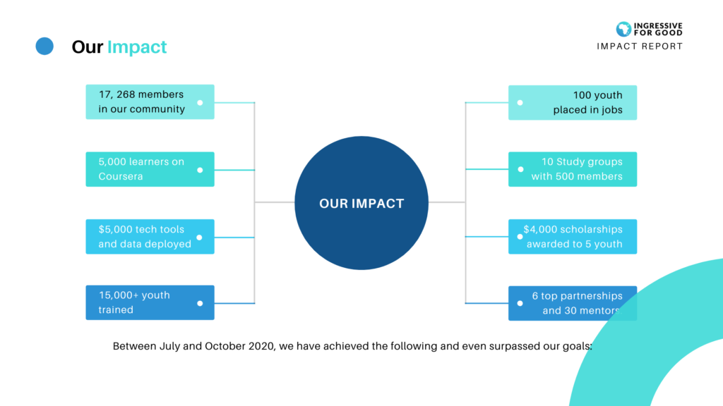 My name is Folashade Fapohunda. I am an accountant. I studied accounting in school. I had a job in a hospital as an accountant but COVID-19 cases started increasing and we were at risk. The company closed down and I had to resign. I casually picked up an interest in graphic design and I started looking for opportunities in design. That was when I came across the I4G Coursera program. I enrolled in the Coursera design course and I learned so much about typography and many other things, I never knew about before. These courses gave me the confidence I needed to start freelancing and so far, I have had over 3 paying design clients. I felt totally empowered. In fact, I still feel empowered. The I4G Coursera program has helped me cement my learning in graphic design for free, courses that were cumulatively worth thousands of dollars were given to me on a platter of gold. I never thought I could be this good at graphic design. I realized that when you open yourself to opportunities, you can always be better. There are so many opportunities and if you don’t get plugged in in the right places (like I4G), you will miss out and never know how much better you can be. I am completely transformed. I4G has transformed me. I4G is a wonderful platform and I advise you to follow everything they do across every platform because your life will be better. You will be completely transformed in 3 months or 2 months or even 1 month. Take advantage of the network. Two key indicators of a country's GDP are the economic power of citizens and the percentage of gainfully employed youth. However, 30% of African youth are unemployed. Ingressive For Good (I4G), a non-profit, is looking to change that with their mission to increase the earning power of African youths through tech training, job placement, and community. In the last three months, I4G has aided the training of over 20,000 African youths, built a community of over 17,000 youths, provided tech tools and resources for over 10,000, and placed over 100 in jobs. "The I4G community collectively has the strategy, the network, and most importantly, the passion to actually change Africa". Sean Burrowes, the COO and Cofounder of Ingressive for Good said. "The more our community grows, the less I4G feels like a charitable foundation. It feels more like a Pan-African talent development revolution, powered by Africa's tech-enabled youth". With collaboration at the heart of Ingressive For Good, is impacting the lives of Africans, one youth at a time. During this pilot phase, I4G partnered with Coursera, Facebook, Datacamp, HNG, SemiColon, Tekedia, Career Buddy, FindWorka, Live Your Dreams, Covenant University, Student Build, Bankole Williams, and so many amazing organizations to reach the Africans in need and provide training, scholarships, job placements. “Ingressive For Good has not only distributed the most licenses of all of DataCamp’s Giveaway Partners so far, but their learners’ adoption and engagement levels on the platform are some of the highest as well. This exemplifies the enormous impact a nonprofit run by caring and talented people can have on communities big and small, local, and abroad.” Nathaniel Taylor-Leach, Community Partnerships Manager at Datacamp, the leading interactive learning platform for data science and analytics “Folashade’s success story is one of many young Africans who have been impacted through one or more of the Ingressive For Good programs. Many have gotten access to courses that were cumulatively worth thousands of dollars for free” Blessing Abeng, Director of Communications at Ingressive for Good Watch the success stories of the I4G x HNG Internship finalists who received new MacBooks from Ingressive for Good to help them improve their tech skills: In the last 3 months, I4G has surpassed its pilot goals in tremendous ways. This is the impact so far: To join I4G on this mission to increase the earning power of African youths and eradicate poverty from Africa, send an email to hello@ingressive.org and Follow @ingressive4good on social media to stay updated.