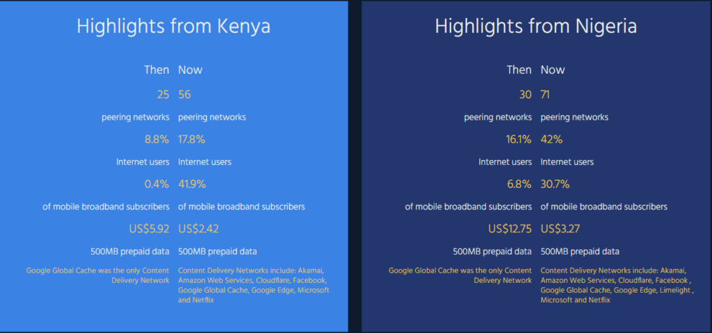 Nigeria and Kenya are now in the second stage of internet ecosystem development, according to the Internet Society. And both countries are on the cusp of achieving stage three development. The second stage of internet ecosystem development is characterized by increased localised internet traffic. Ten years ago, the Internet Society (ISOC) envisioned that 80% of African internet traffic would be localised by 2020. However, nearly 70% of internet traffic in both countries are now localised. This has resulted in lower latency. And it has given Nigerians and Kenyans access to relatively affordable and faster internet. Most of the content and internet traffic in both countries now go through local exchange points (IXPs). These are the Internet Exchange Point of Nigeria (IXPN) and the Kenya Internet Exchange Point (KIXP). International content is also available locally because content delivery networks (CDNs) are setting up Point of Presence on the continent. A case in point is the streaming of Eliud Kipchoge 1:59 INEOS Challenge. Because of Google Point of Presence (PoP) in Kenya, millions of people were able to watch the live stream on Youtube. According to Safaricom, which offered free data bundle, over three million people subscribed to the 159 Youtube data bundle. Youtube also recorded its highest traffic in Kenya on that day, October 12, 2019. > **Related Artile:** [Right of Way charges have been baulking broadband penetration](/broadband-right-of-way-ng/) Some eight years ago, however, it would have been difficult for millions of people to watch the live stream. ISOC explained the internet "simply wouldn’t have been fast enough to keep up, or been accessible to many people". The role of Internet Exchange Points in providing faster and less expensive internet IXPs are like a rendezvous where networks exchange traffic. Without IXPs in Africa, internet service providers (ISPs) would have to use their international internet protocol transit to exchange global internet traffic, local traffic, and access content hosted abroad. By enabling local traffic to remain local, IXPs lower the cost and latency of exchanging internet traffic and accessing content. In 2012, only 30% of traffic in Kenya and Nigeria were localised. That was the first stage of internet ecosystem development. Both countries, according to ISOC, had a strong base of growth. Both had static international content available via a Google Global Cache. But there was no locally available content because they were hosted abroad. Thus, eight years ago, the peak IXP traffic in Kenya was 1Gbps and 500Mbps in Nigeria. KIXP and IXPN were only able to help ISPs save $1.4 million and $1.08 million, respectively. Today, however, the ISOC reported that Nigeria and Kenya are near stage three of internet ecosystem development. To fully achieve stage three, however, local content must be developed and hosted locally. The 2020 report is titled, "Anchoring the African Internet: Ecosystem: Lessons from Kenya and Nigeria’s Internet Exchange Point Growth". According to the ISOC, the peak traffic of KIXP in 2020 is 20Gbps. It has also grown from 25 peering networks in 2012 to 56 peering networks in 2020. Similarly, IXPN peak traffic is now 125Gbps. Its peering networks include international content providers such as Akamai, Facebook, Google, China Telecom, Glo, and Main One. According to the ISOC report, West African Internet Exchange (WAF-IX) launched in Lagos two years ago. Its primary goal is to help content providers deliver content from their PoPs in Nigeria throughout the West African region. It is an initiative of Main One. And with the support of Asteroid, WAF-IX would leverage the submarine capacity of Main One to add future nodes in Ghana, Ivory Coast, and Senegal. Senior Director of Internet Technology and Development for the Internet Society, Michuki Mwangi, said: "Kenya and Nigeria are in a better position than ever before to cope with – and contribute to – the digital revolution that COVID-19 has accelerated as the internet becomes a lifeline for many people. "It’s clear Africa is ready to embrace the digital revolution to spur economic development. But reaching this goal will depend on our community of passionate people on the ground, policymakers, regulators and businesses embracing IXPs and working in collaboration to create these essential local traffic anchors". The ISOC is a global non-profit working to ensure the Internet remains a force for collective good of everyone. It was founded in 1992 and have over 130 chapters around the world. What Kenya and Nigeria must do to achieve stage three of internet ecosystem development To move forward into Stage 3 of development, in which more than 70% of traffic is localized, will require several further developments: Local content developers, including the government in some cases, who are hosting their content outside the country, will need to bring it ‘home’ to increase local traffic. Smaller ISPs in the countries will need to connect to the IXPs to increase the efficiency of their interconnections. Domestic infrastructure will have to be extended beyond the main landing point for submarine cables and into the other major population centres. What other African countries can learn from the success of Nigerian and Kenyan IXPs The report concluded that other African can learn from the experience of Nigeria and Kenya. It said both countries have made tremendous strides since 2012 towards a strong healthy, internet ecosystem, and they are reaping the rewards. Other African countries can: Leverage the relationship between IXPs and carrier-neutral data centres. IXPs tend to come before data centres and can help facilitate their development Ensure sound governance of the IXP. This is crucial to effectively manage the IXP’s future membership, traffic, and node growth. Create economies of scale to lower costs. Large international content providers have the scale to extend their netwo