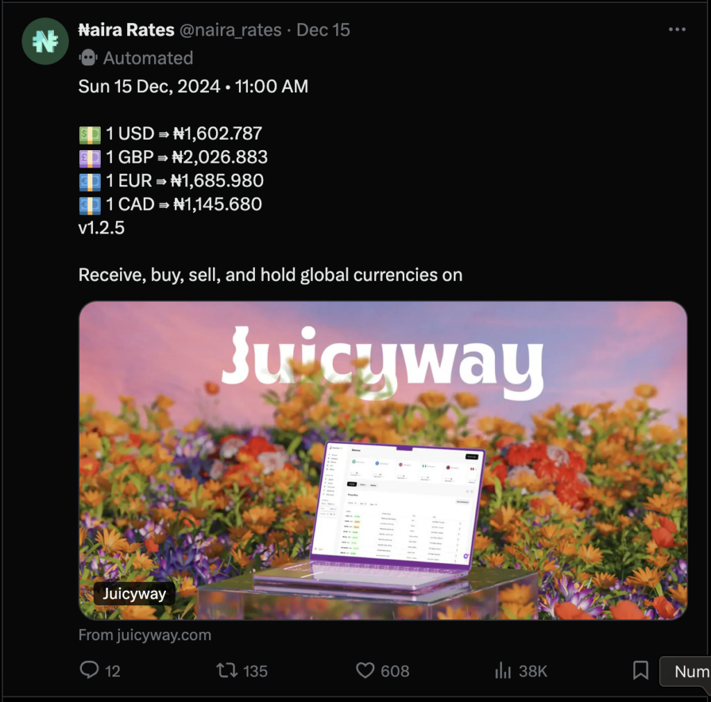 Juicyway, a Nigerian stablecoin-powered cross-border payment startup, announced its $3 million pre-seed. P1 Ventures, an early-stage African investor, led the pre-seed round. Africa-focused investment firms, Ventures Platform, Future Africa, Magic Fund and Microtraction participated. Andrew Alli—former AFC CEO, Gbenga Oyebode of Aluko & Oyebode and Tunde Folawiyo—former Access Bank Board member are Angels. According to a statement shared with Condia, the startup will invest in its technology, team, and markets with this funding. Ife Johnson (CEO) and Justin Ziegler (COO) founded Juicyway in 2021. Despite increased globalisation, African businesses find it difficult to get foreign accounts, access foreign currencies and make international payments. On the flip side, businesses looking to expand to Africa need local accounts for operations and foreign liquidity for repatriation. KYC/AML requirements, regulatory barriers and low trade volumes make this a challenge. With low-trade volumes come fewer competitors which has made payout cost and FX margins high. For instance, remittance to sub-Saharan Africa is the highest in the world at 8.2%. Johnson, ex-Bamboo and Ziegler, ex-Andela saw the challenges their previous employers faced in moving money to and from Africa. CEO Johnson tells Condia, "I’ve had way too many struggles as an executive for it to make sense to me that this problem hadn’t been solved...". So, Juicyway enables individuals and businesses to send, receive, and process payments globally. The platform offers multicurrency accounts in Nigerian Naira (NGN), US dollars (USD), and Canadian Dollars (CAD). It also offers USDC and USDT stablecoin wallets. Thus, its customers can use one account to receive money, convert it to another currency, and make payments globally. “Africa contributes less than 1% to the $5 trillion global currency market, partly because there’s no liquidity for intra-African currency pairs. The old systems weren’t built to support this. Our ultimate goal is to unlock liquidity for African currency pairs that currently have none. Stablecoin technology and our network model make this vision achievable by enabling fast and efficient money movement. Without it, we’d still be in pursuit of this goal, but it would be far harder to achieve," adds Johnson. To build the product, the startup has secured licenses in Nigeria, Canada, the USA and the UK. Juicyway has a local payment (PSSP) and an international money transfer operator (IMTO) licence in Nigeria. In the UK, it is an Authorised Payment Institution (API). In Canada, it is a Money Service Business (MSB) while in the US, it is a money transmitter (MTL). Its IMTO licence allows it to partner with Access Bank to bring money into the country. Juicyway works with Lead Bank, a US bank that partners with fintechs like Revolut to issue USD accounts. For its crypto service, it has partnered with Bridge, recently acquired by Stripe. In its three years of operation, Juicyway processed over $1.37 billion across 25,000 transactions. Its corporate customers include Afriex (remittance), Bolt, and Mocoh SA (a global energy and logistics firm). "The fintech’s revenues come from processing and payment fees, with take rates ranging from 0.2% to 10% on certain transactions," TechCrunch reports. Assuming an average take rate of 2%, the company would have made about $30 million in revenue, since reception. "Moving forward, it’ll look to generate additional revenue from earning interest on customer balances," the report says. Juicyway's moat, Naira Rates—a rate discovery engine Obscurity in trade rates and ignorance of counterparty volume are some of the big drivers of the volatile and disparate spreads in the market. To negotiate, market participants are often on the hunt for the best exchange rate. The company addressed this need by building a tool, Naira Rates which spits out the exchange rates for key currency pairs. Launched on Twitter (now, X) in 2022, @Naira_rates has grown to become a trusted source of exchange rates with nearly 500,000 followers. Shortly after, the company followed up with crypto exchange rates. The formerly anonymous handle, Naira Rates has become one of the company's moats. In recent times, market rate tweets from Naira Rates include a link to Juicyway's website. Screenshot of a tweet from Naira Rates With Naira Rates, Juicyway now controls an important part of the foreign exchange value chain. Both feed into each other. According to the statement, "By displaying real-time rates based on what other users are willing to pay, Juicyway fosters a liquid ecosystem that reduces remittance costs. This empowers users to trade confidently, promoting financial inclusion and economic growth." “Juicyway's innovative and forward-thinking approach to cross-border payments strategically positions it as a transformative force in Africa's rapidly evolving financial landscape,” Dotun Olowoporoku, Managing Partner at Ventures Platform says. “By leveraging cutting-edge technology and deep market knowledge, Ife, Justin and the team exemplify our investment thesis of democratizing prosperity in Africa through innovation.” Hisham Halbouny, Co-Founder and Managing Partner at P1 Ventures who is leading the round said: "We couldn’t be more excited to partner with Ife, Justin and Idris as they tackle one of the most critical challenges in finance. By leveraging innovative stablecoin technology, they’re leapfrogging outdated infrastructure to create a seamless, efficient, and inclusive cross-border payment system that reshapes how Africans connect with the global economy." This funding will drive Juicyway's growth by supporting team expansion, technological advancements, and entry into new markets. The round includes the addition of Joshua Wasserman, a compliance and regulatory expert with experience at the US Federal Deposit Insurance Corporation (FDIC) and a key leader in building compliance for Cash