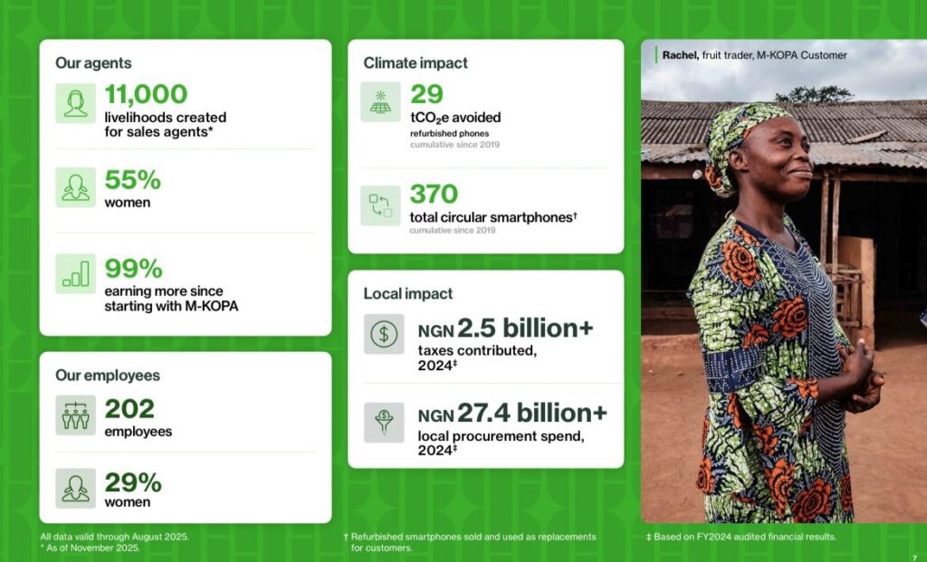Unlike app-only lenders, M-KOPA’s Nigerian business is built on a physical network of 11,000 direct sales agents, more than half of them women. Agent churn stands at 0.1%. In a lending market known for short operating cycles and reputational volatility, that kind of stability is not incidental.