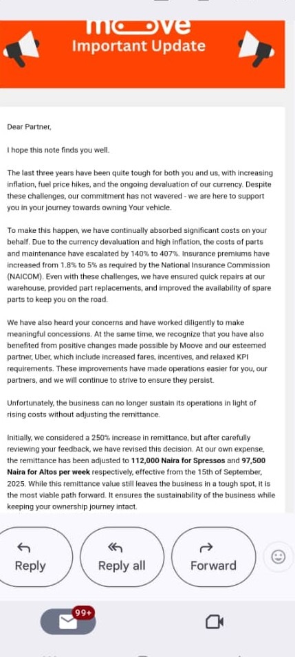 Citing Nigeria’s blistering inflation, rising fuel costs, and currency devaluation, Moove reportedly hiked Ovie’s daily remittance from ₦9,400 to ₦18,700. Furthermore, the company unilaterally revised the agreement, adding three years and two months to his repayment term. “They are insisting I pay ₦18,700 daily for an additional three years—amounting to ₦20 million,” Ovie says.