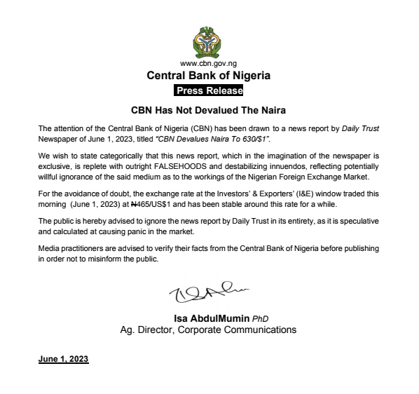 On Thursday, local media reported that the Central Bank of Nigeria (CBN) devalued the Naira to ₦631 to the dollar from ₦461.6 it sold at the Importers and Exporters (I&E) window the previous day. In response to the report, the CBN said the report is false. "The public is hereby advised to ignore the news reports by Daily Trust [the local publication that broke the news] in its entirety, as it is speculative and calculated at causing panic in the market," Isa AbdulMumin, Director of Corporate Comms at the CBN, said. According to the bank, the Naira exchange rate at the I&E window is currently ₦465 to $1. AbdulMumin says that aforementioned rate has been stable for a sometime now. At his inauguration as Nigeria's new president on Monday, Bola Ahmed Tinubu said that "[The country's] monetary policy needs a thorough house cleaning. The Central Bank must work towards a unified exchange rate. This will direct funds away from arbitrage into meaningful investment in the plant, equipment and jobs that power the real economy." Tinubu met with the CBN Governor, Godwin Emefiele on Tuesday but the outcome of the meeting has not been made public. This is a developing story