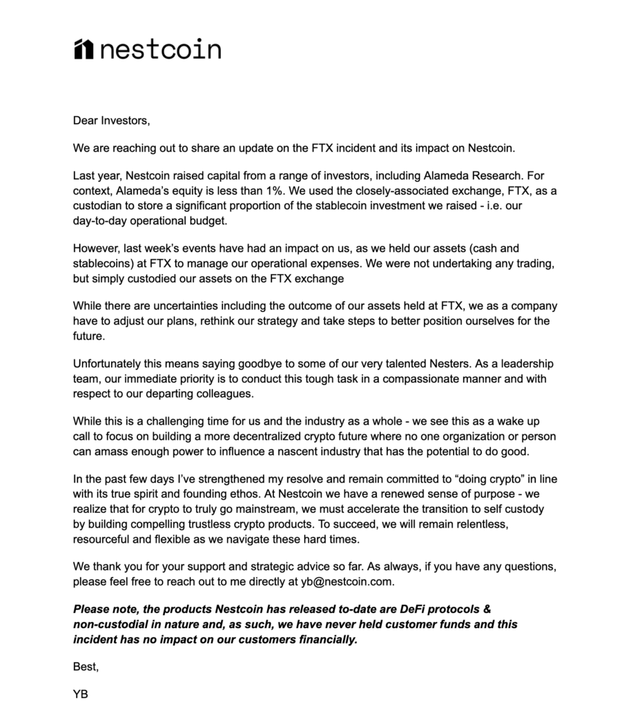 “Last week’s events have had an impact on us, as we held our assets (cash and stablecoins) at FTX to manage our operational expenses. We were not undertaking any trading, but simply custodied our assets on the FTX exchange,” Yele Bademosi, Nestcoin’s co-founder and CEO, writes. “Unfortunately this means saying goodbye to some of our very talented Nesters (Nestcoin’s employees’ nickname).”