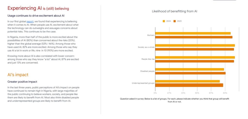 88% of Nigerian adults used an AI chatbot in 2025. That's an 18-point jump from the year before, according to new data from Google and Ipsos. The global average sits at 62%. What started as curiosity has become routine. Students are using ChatGPT to work through physics problems. Entrepreneurs are drafting business plans on Gemini. People are using AI for career planning, learning new skills, starting businesses. The question isn't whether Nigerians are adopting AI—clearly they are, faster than most places—but what that adoption is actually building toward. The numbers look like validation: Nigerians are early adopters, enthusiastic experimenters, exactly the kind of users AI companies claim they're building for. How Nigerians are using AI The 2026 report, Our Life with AI: Helpfulness in the Hands of More People, shows the shift clearly. 93% of Nigerians use AI to learn or understand complex topics, up from 81% in 2024 and well above the global 74%. At work, 91% rely on AI tools for tasks. 80% are using AI to explore new business ideas or career changes—nearly double the global figure of 42%. "It's inspiring to see how Nigerians are creatively and purposefully using AI to unlock new opportunities for learning, growth, and economic empowerment," said Taiwo Kola-Ogunlade, Google's West Africa communications manager. "This report doesn't just show high adoption rates; it tells the story of a nation actively shaping its future with technology." Last year's users were experimenting. This year, they're integrating AI into how they work, learn, and plan. The technology has moved from novelty to infrastructure faster in Nigeria than in most other markets. In places like the U.S. and Europe, educators and policymakers are still debating whether AI belongs in classrooms at all, weighing its learning benefits against privacy risks and over-reliance concerns, according to a January 2026 Axios report. Education is leading AI Adoption in Nigeria 9 in 10 Nigerians say AI improves how people learn and access information, and 95% believe students and teachers benefit directly. From simplifying coursework to exam prep, AI has become a default study tool—a shift that has happened more completely in Nigeria than in markets still debating whether AI belongs in classrooms. This adoption matters because it isn’t just about convenience or entertainment. Nigerians are using AI to understand complex topics, acquire skills, and prepare for work or entrepreneurial opportunities. The intent is clear, even if broader economic outcomes are still uncertain. A case of unusual optimism 80% of Nigerians say they're more excited than concerned about AI's potential. Globally, opinion is split nearly evenly: 53% excited, 46% worried. Among frequent Nigerian users, optimism rises to 90%. That confidence extends to institutions. 94% trust tech companies to manage AI responsibly, significantly higher than global averages where tech company trust is generally declining. 69% trust government regulation of AI. The trust levels are striking because they're so different from patterns in markets where AI is being developed. In London, or Beijing, people who work closely with AI tend to be more cautious about its risks and limitations. In Nigeria, familiarity seems to breed confidence rather than concern. Whether that optimism is warranted depends partly on how quickly the ecosystem can build local capacity—not just consumption of AI tools, but development of them. In Nigeria, familiarity appears to breed confidence rather than concern. This optimism is justified depending on how quickly local capacity is built, both by using AI tools and developing them. What the numbers don't show High adoption creates both opportunity and risk. Developers and entrepreneurs can build services on top of these platforms or create alternatives tailored to local needs. At the same time, dependency on foreign-built tools could limit value capture. The fintech parallel is instructive. Early mobile money adoption in Nigeria eventually produced a thriving local fintech ecosystem, supported by responsive regulation and homegrown innovation. Whether AI follows a similar path remains to be seen. For now, Nigeria is leading the world in AI adoption. How that momentum translates into local innovation, economic impact, or sustainable advantage is still unfolding.