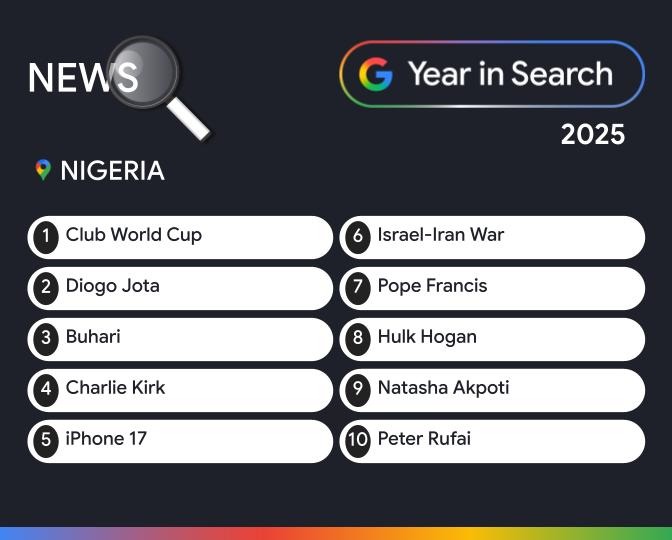Google released its Year in Search for Nigeria on December 4. Senator Natasha Akpoti topped the personality list, but further down the trends, a different pattern emerges. 2025 wasn’t dominated by scandals like 2024: no Bobrisky legal circus, no Yahaya Bello corruption saga. Instead, searches centred on those who passed away—former President Muhammadu Buhari, Super Eagles legend Peter Rufai, Pope Francis—and questions like what “Labubu” means.