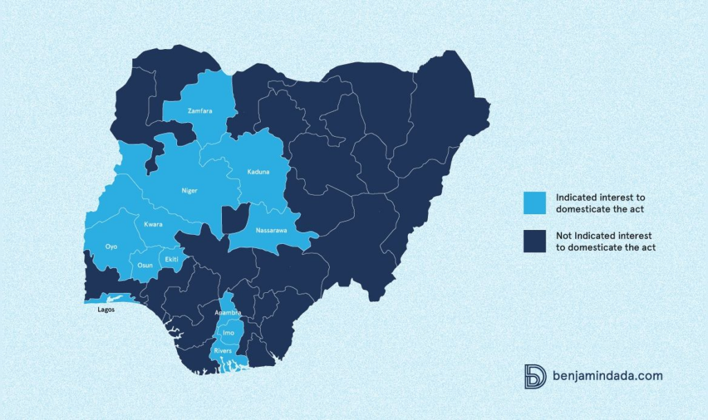 Out of Nigeria’s 36 states, only twelve—Kaduna, Lagos, Kwara, Ekiti, Anambra, Imo, Niger, Nassarawa, Oyo, Rivers, Osun and Zamfara—have indicated interest to domesticate the Act, Ms Okoro disclosed to Benjamindada.com via a call.