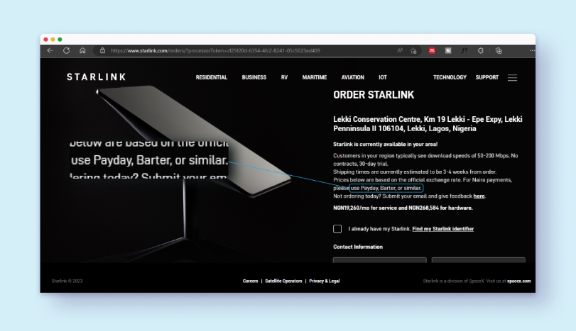 Starlink has cited two Nigerian fintechs as recommended options for Nigerians to make payment for its product. "For Naira payments, please use Payday, Barter, or similar", reads a statement on Starlink's official order page which shows up after a customer has specified their service address. The website copy update comes weeks after many Nigerians complained about not being able to make payment despite SpaceX displaying Starlink's price in naira. Assuming Starlink's display price was in dollars, many of the country's residents would not bother trying out their local cards because they are familiar with the country's restriction on foreign payments. So, when we wrote about setting up Starlink in Nigeria, one of the frequently asked questions was, "what payment method can I use to pay for Starlink"? In that article, we mentioned that virtual dollar cards offered by the likes of Payday continue to work as a viable payment method for Starlink. So, Starlink referencing "...Payday, Barter, or similar" confirms virtual dollar cards work on their site. Fun fact: Flutterwave provides regulatory backing for both Payday and Barter. Today, I finally completed an order for Starlink using Payday. Here are five things I noticed. First, although Starlink says that "For naira payments...use Payday..." it doesn't mean that Nigerians can make payments using a naira card from Payday. They mean that Nigerians can make payments using Payday and the like. Payday doesn't issue virtual naira cards; they only issue USD Mastercards and Visa. Second, I could create a virtual Mastercard on Payday for free! No card creation fee. Many card issuers charge a creation fee to help cover some of the costs incurred from the card schemes. Third, Payday offered an option to create a virtual Visa card but with a $3 creation fee. The Visa card gives customers who want additional security more comfort with its 3D secure feature. However, because I like free and can control how much is in my card at a time, I opted to use the Payday Mastercard for my Starlink order. Also, the difference between the cost of funding and withdrawing from a Payday virtual dollar card is not drastic. I could fund my Payday with naira at the rate of ₦760 to $1 and withdraw dollars at the rate of ₦743. Some other virtual dollar card providers I've come across, fund high, and withdraw low with an arbitrage of more than ₦50. Finally, the conversion fee on Payday is 0.5% of the amount but capped at $5, which is economical for high-value transactions. Steps to create a Payday virtual dollar card If you are keen on trying out Payday, follow these steps: Download, sign up and log into the mobile app Create a virtual card. Top-up the card from your USD wallet. If your KYC is incomplete, you'd need to fill it out by entering your BVN, Date of Birth, Gender, and Phone number. Then, to pay on Starlink's website, you grab the card details from the app and enter them on the order page. Viola! Check back on Wednesday, February 22, 2023, for more updates and screenshots.