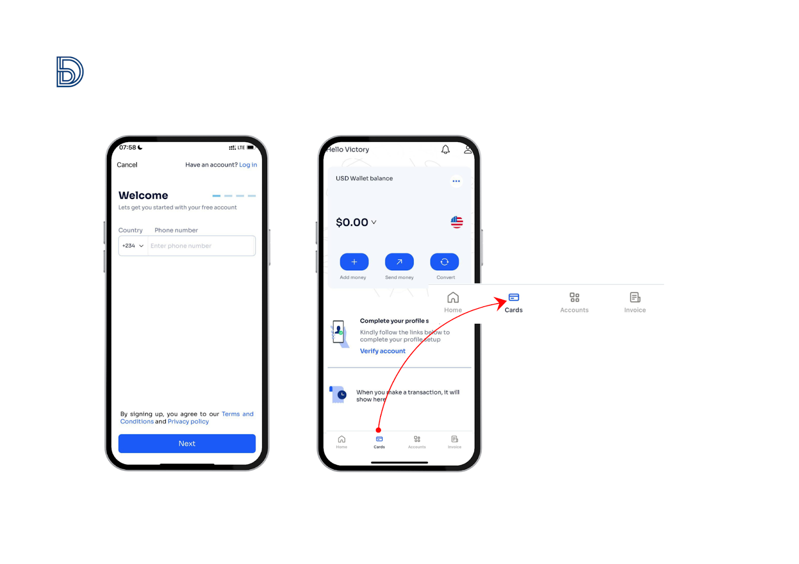 - Go to the “Cards” section and select your virtual dollar card.