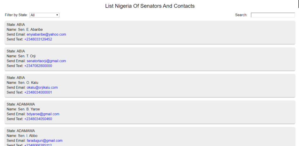 Either as a result of Nigerians nonchalance or sheer political apathy, the Protection from Internet Falsehood and Manipulation Bill 2019 (AKA Social Media Bill (SMB) has passed the second reading in the Senate House. The second reading is the fifth stage of the legislative process in Nigeria. This means the SMB has only six more stages till it becomes a law. Contrary to the propaganda being propagated by its proponent, Senator Muhammad Sani Musa (APC-Niger East), the SMB will essentially stifle public discourse on social media and provide a leeway for the Federal Government to shutdown the internet. More than five African governments have set a disturbing precedence of shutting down internet in their countries. Therefore, civil society organisations (CSOs) and concerned Nigerians have called on every citizen that mean well for the country to talk to the senator representing their constituency and demand the quashing of the demonic bill. The list of all 109 senators and their contact details was made public. ADAMAWA Sen. B. Yaroe08034050460 | bdyaroe@gmail.com Sen. I. Abbo08066285112 | faradugun@gmail.com Sen. A. Ahmedaishatu.ahmed@nass.gov.ng — Ólùsó àti Áfàdúràjagun Íjo Patriarchy (@VillageParrot) November 22, 2019 To make it accessible for all and sundry, Nigerian developers decided to produce web and mobile apps that will allow anyone to easily call, message or send their senator a mail. The apps also have templates of messages to be sent, making it easy for everyone to #SayNoToSocialMediaBill Enough is Enough Nigeria (EiE Nigeria) database provide similar service and comprehensive information about each senator in the 9th Assembly. Shine Your Eye Naija Developers Someone should turn this into a simple mobile web app. - Search by Senator name / district to get their info easily- Send text message via the app ASAP- Go further to provide template messages to be sent to avoid stress Can be done in less than 2hrs https://t.co/vjcCuf4laT — Prosper Otemuyiwa (@unicodeveloper) November 23, 2019 These are the web and mobile apps developed for #SayNoToSocialMediaBill 1. Senate Members Directory developed by Samaila Philemon Bala Senate Member Directory 2. List of Nigerian Senators and Contacts developed by Bola Ahmed Buari List of Nigerian Senators and Contacts 3. Nigeria Senators mobile app developed by Rotibi Adedeji Nigerian Senators App 4. Nigeria Senators developed by Olalekan Kolapo Nigeria Senators 5. Senators contacts by name or by state developed by Silas Adedoyin Nigeria Senators Contact 6. Know your leaders developed by Soliudeen Ogunsola Know Your Leaders