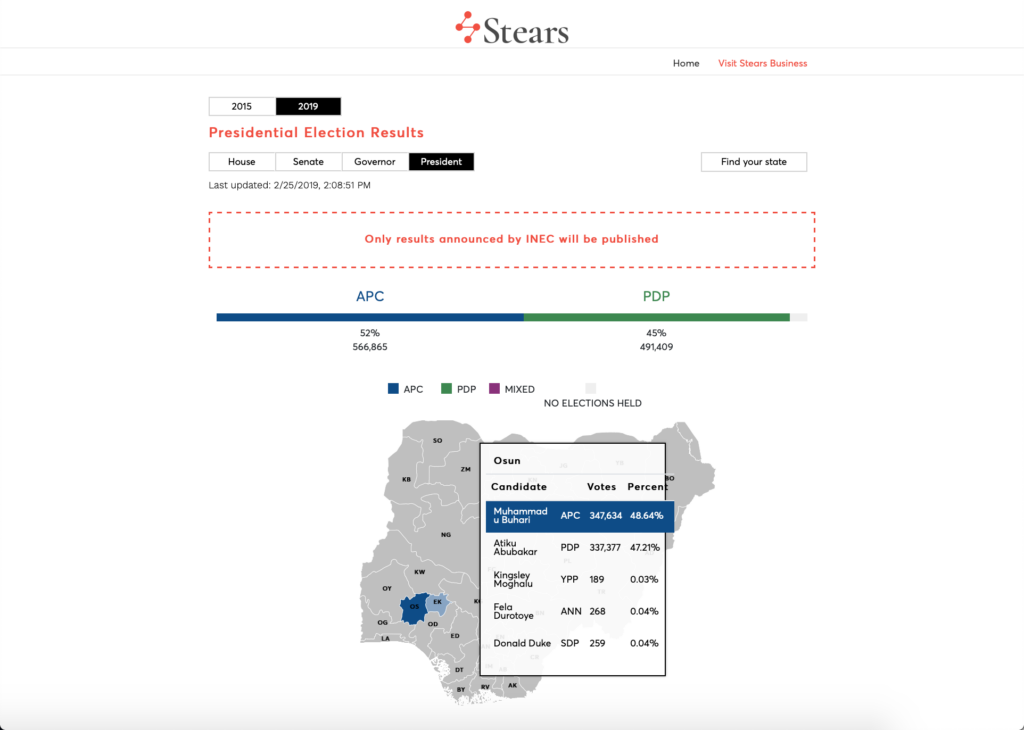 Left to right, Stears cofounders: Abdul Abdulrahim, Preston Ideh, Michael Famoroti, with advisor Olabode Ogunlana Two weeks before the much-awaited 2019 Nigerian Presidential elections I had the pleasure of meeting with partners at Stears Business, makers of the Nigerian Elections Centre. We talked about Stears history, the need for access to accurate data, and the development of the Stears Election Center. Stears Election Centre and the Nigerian Elections A few years ago, three Nigerians in the diaspora studying at the London School of Economics (LSE) met with another Nigerian at Imperial College to discuss a relatable Nigerian problem—poor access to high-quality data and content. Starting 2016, these four Stears cofounders set to work with a group of Nigerian writers to distribute data-driven insight. Today, Stears is one of the most regarded news sites sharing opinions, analysis and reporting on the Nigerian situation. However, in October 2018, it dawned on them that "there is no data more relevant and relatable to all Nigerians than election results", so, they got to work. Every four years in Nigeria, there is a voting exercise that sees citizens go out to vote for their preferred candidates. However, due to the high level of voter apathy in the state a lot of Nigerians do not seem to care about the elections. Many end up not registering, collecting or actually voting on the D-Day. At crucial times like elections, citizens are flooded with fake news, click-bait-driven stories and inaccurate reporting spread via social media, and as such they cannot tell when information is true or false. This is why social media organisations like Facebook have put structures in place to reduce the spread of misinformation and protect election integrity. Facebook has more than 26 million users in Nigeria "There is a poor culture around data-driven insight, meanng that policymakers, politicians, investors and entrepreneurs rely on anecdotes of Nigeria's future, fabricated or out-of-date data and even propaganda when framing issues", says Michael. This poor data-driven culture is fueled by the near impossibility of accessing said data. And it is easy to guess why. "Availability of data requires rigorous research and data collection, powered by a coordinated system to disseminate this data", Stears affirms. Nigeria has a National Bureau of Statistics (NBS) that oversees and publishes statistics for the country. However, the burden of publishing elections data is left to the organising body—Independent National Electoral Commission (INEC). Unlike INEC which published the 2015 elections data on a spreadsheet document, the NBS goes further to visualise their own data, turning it to insights which is useful in decision making. These problems of poor access to inaccurate and rudimentary data is what Stears is looking to solve with their Elections Centre platform. Stears Election Center Currently, on the Stears Election center site, visitors are able to see results of Nigerian state and constituency results with the exclusion of wards and polling units. However, they have plans to include the local and polling unit data. "Our longer-term goal with the Election Centre is to go deeper into local and polling unit data; recording, collecting and disseminating data beyond results", Stears confirmed. They have completed the upload of Presidential and Gubernatorial data from the 2015 elections, and intend to go further back to previous elections. Users of the site can drill down to States. So for instance, as a Lagosian I can choose "Find your State" and select Lagos, which falls into the South-Western geo-political zone of Nigeria. Figure 2: Inside Lagos State, retrieved by 2:30 PM from Stears Election Centre The site also doubles as a portal for voters education. Citizens and site visitors can learn more about how elections work in Nigeria. Questions like "How is the President of Nigeria determined?" and "What are the qualifications to become the President?" are answered on the site. While Stears only publishes results announced by INEC, they have mentioned that they did not leverage any special connections to INEC staff. For Stears partner, Michael, success is when they are able to "give people a source they can trust for accurate election results and build a habit of looking at trends in election results". The future for Stears Election center is having data on incident reporting, exit polling and making predictive analytics. At the end of the elections, they are looking to tell the "full story of the 2019 elections" via the online publication arm, Stears Business.