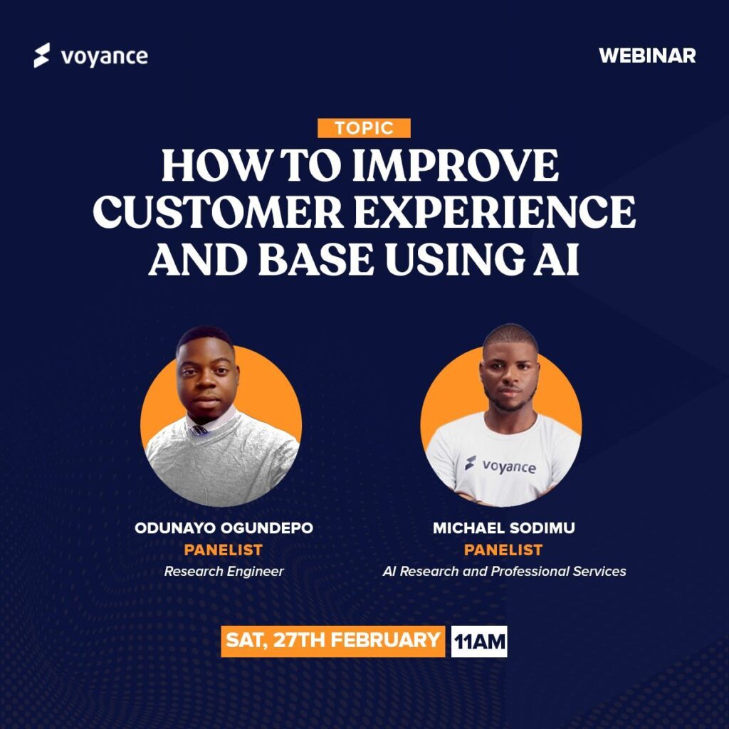 The Voyance team is committed to educating the community about data and offering relevant tips to businesses about fully maximising their data efforts. The Voyance webinars are a key part of its efforts to increase awareness about the immense benefits of a data-driven business. They cover a range of topics that will help businesses identify problems data science can solve in their businesses. The sessions also guide early data science adopters on how to reap the dividends of their data investments. Topics to be covered include; How to Improve Customer Experience and Base Using AI, Combating Customer Churn With AI and Machine learning in Fintech and lots more In this first webinar session, Voyance’s Research Engineer, Odunayo Ogundepo and AI Lead, Michael Sodimu will be sharing their years of experience in assisting companies to make their customer experience better using Artificial Intelligence. The webinar will hold on Saturday, 27th February 2021. Click here to be a part of this interesting conversation. Odunayo and Michael will be answering questions about keeping your customers satisfied in this webinar titled: How to Improve Customer Experience and Base Using AI. The experience of a customer captures all of the customer journey and how it can be maximized to reduce friction. Get your customers to stay loyal to your company and learn how to fix the problems that are costing you, customers. In this first one-hour webinar, you will learn from top professionals in the data industry on how to: 1. Automatically generate and analyze customer feedback 2. Gain insights using existing generated data to make efficient decisions 3. Use AI to improve sales. You can start making accurate business decisions with data generated from your company today. Keep your spot here. In the past, only a few companies could get a good understanding from their data, so Voyance decided to step in. They built an automated platform that helps businesses save time and get clean data without even knowing how to code. It also allows Data Scientists to build, train and deploy machine learning models on the platform. Voyance’s work is centred around simplifying data analysis for businesses so they can focus on making better business decisions. Save your spot to join this first webinar here. At Voyance, you can run complex models and transformations on your data to increase decision making efficiency, with zero stress. The best part is the access your business analysts have to a data warehouse; a place to build and share analytical reports with the rest of the team, without worrying about data compromise. ‘How to Improve Customer Experience and Base Using AI’ webinar will hold: Date: Saturday, February 27, 2021 Time: 11 AM to 12 PM (GMT) Be the first to know about future webinars organized by the Voyance team. Join the waitlist by clicking this link.