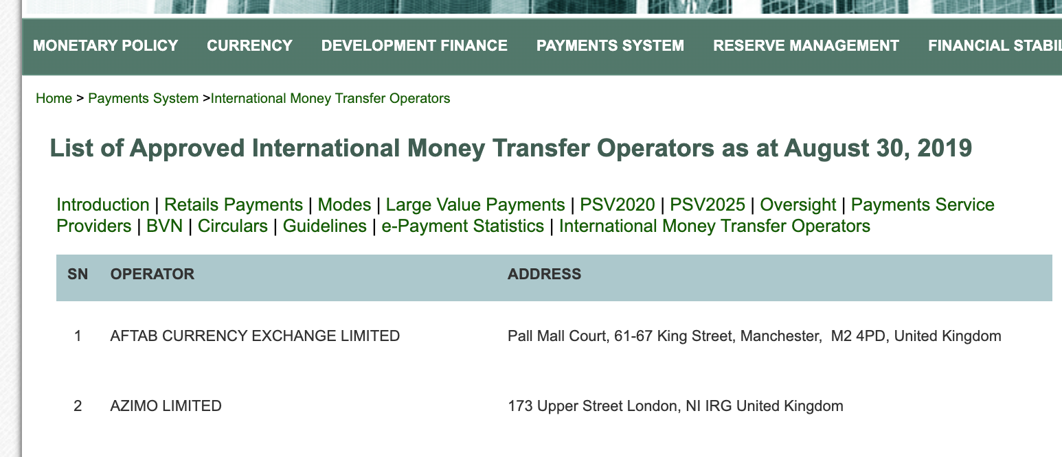 - It’s unclear which Azimo the CBN was referring to because as of the year before, an Azimo was listed as an IMTO and the year after (2021), said Azimo was still listed (meaning its licence was not revoked).